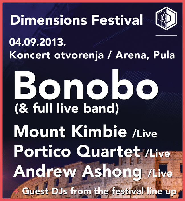 Nakon prošlotjednog spektakularnog nastupa The Original Wailersa i Grandmaster Flasha kojim se najavio ovogodišnji iznimno uspješni Outlook festival, u srijedu 4. rujna pulska će Arena još jednom ugostiti kremu svjetske elektronske scene. Kao najava za ovogodišnje, drugo izdanje Dimensions festivala (5.-9. rujna 2013.) nastupit će Bonobo u posebnom izdanju s bandom, Portico Quartet, Mount Kimbie, Andrew Ashong te nekoliko DJ-eva s festivalskog line-upa čiji će nastup biti iznenađenje za sve posjetitelje pulske Arene.