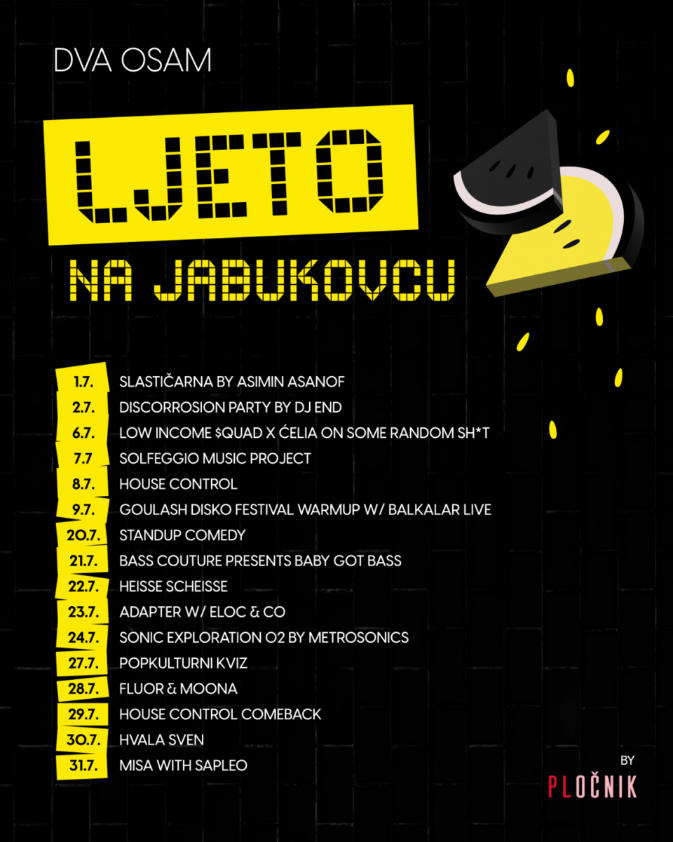 Ljeto na Jabukovcu organizirano je u suradnji s Pločnikom pa ćeš neke od svojih omiljenih DJeva iz plavog podruma Klein naći i u DVA OSAM.