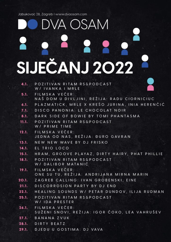 Novu godinu započinjemo s pregršt raznovrsnih glazbenih i drugih programa! Vidimo se na čašici razgovora na Pozitivan ritam RS&Podcastima utorkom, na filmskim večerima srijedom, a na plesnom podiju četvrtkom, petkom i subotom.