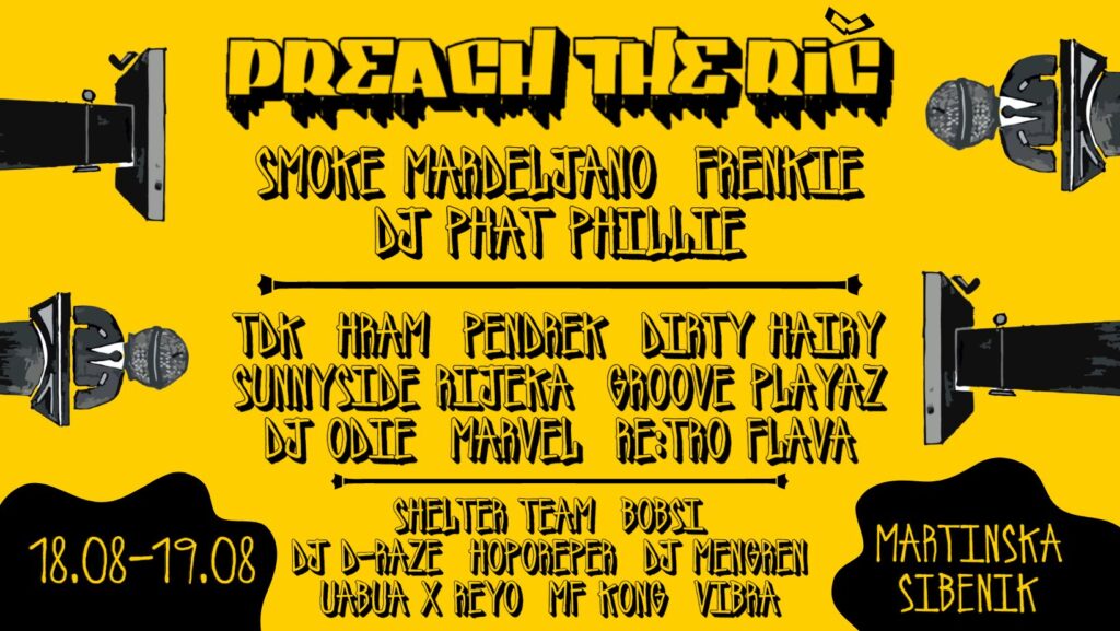 Nakon što smo najavili da dvije najveće regionalne zvijezde hip-hopa i repa, Smoke Mardeljano i Frenkie predvode lineup prvog ikad hip hop festivala PREACH THE RIČ, donosimo popis svih ostalih izvođača. Ljubitelji ovog žanra i dobre glazbe sigurno neće ostati razočarani. Pred nama je još dvadesetak jakih imena sa scene koji će nastupiti na pozornici na Martinskoj 18. i 19. kolovoza.