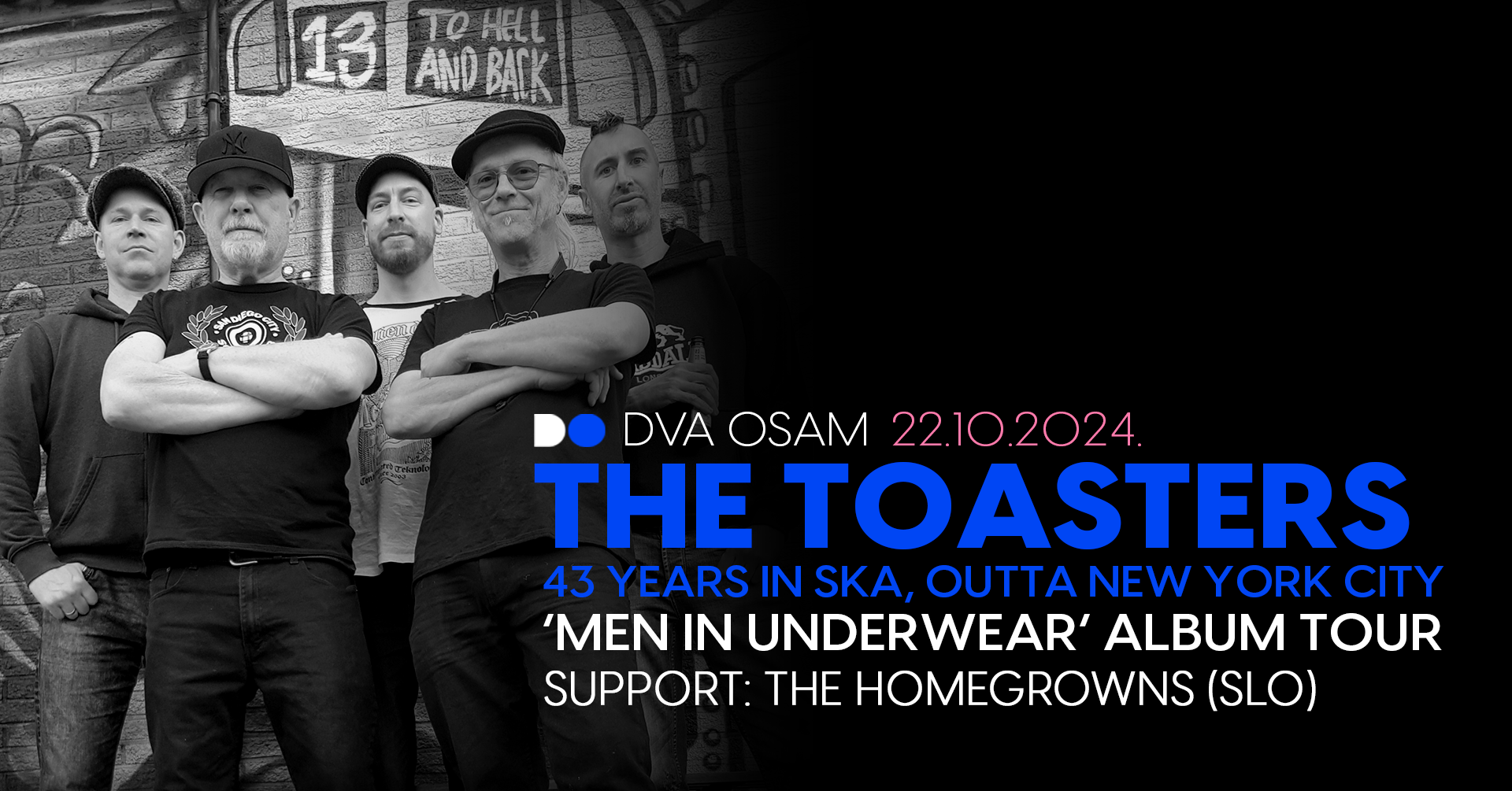 The Toasters su ponovno na turneji te se vraćaju u Zagreb, tu će predstaviti i svoj najnoviji album "Men In Underwear", objavljen ove godine za izdavačku kuću Mad Butcher Records. Osim novih pjesama, The Toasters će izvesti i svoje brojne ska hitove, kojima su zarazili cijeli svijet. Ova turneja slavi 43 godine The Toasters u ska vodama, bend je aktivan otkako je 1981. osnovan u New Yorku. Postava benda, koja se predstavlja na novom albumu, sastoji se od Bucketa (gitara/vokal), Borisa Maninveldta (bubnjevi), DJ Heinstre (saksofon), Adriena Le Mieuxa (bas) i Tima Duwela (trombon).