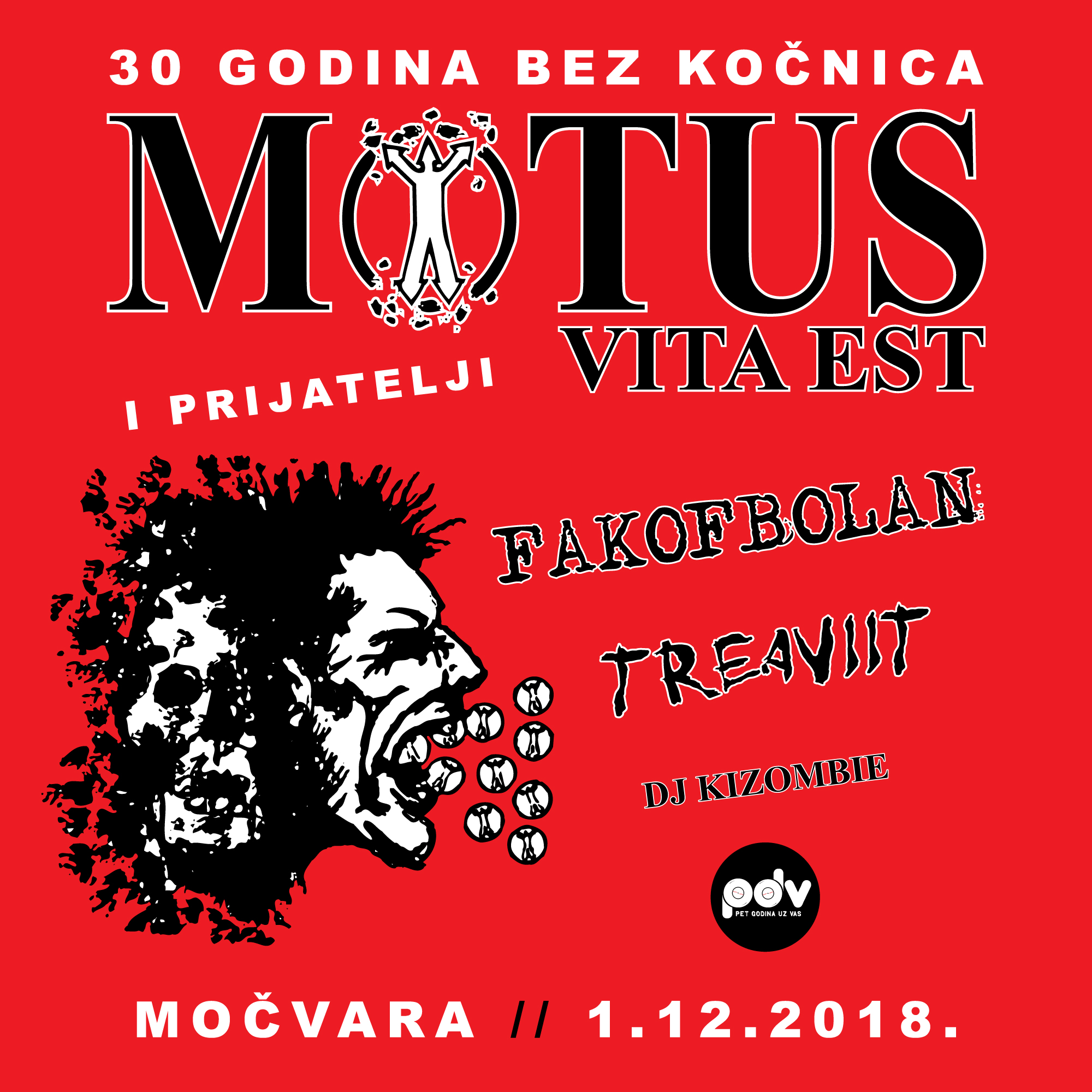 U to ime svi su pozvani na proslavu povodom obilježavanja trideset godina djelovanja benda Motus Vita Est u zagrebačkom klubu Močvara. 03.01.1988. bend je snimio svoj prvi demo. Od tada su izdali pet dugosvirajućih albuma (Cogito Aude, Razlike, Nasred puta, Psi, Mašina), odsvirali su bezbroj regionalnih i europskih koncerata, te se upravo vratili sa mini turneje po Švicarskoj koja je odlično poslužila kao priprema za koncert u Močvari. Već tradicionalno Motusi na svojim proslavama ugošćuju prijateljske bendove, a za ovu priliku nastupit će odlični punk-rockeri Fakofbolan (Pula) i Treaviit (Karlovac). Motusov recentni album Mašina potraži ovdje kao i izdanja Fakofbolana.