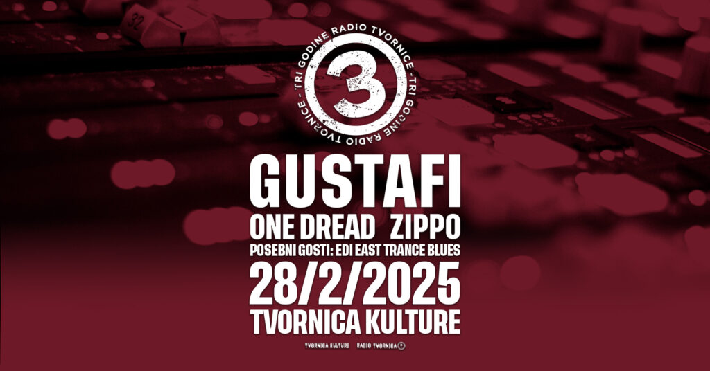 Naš radio bez kočnica, jedan i jedini, Radio Tvornica, slavi tri godine uspješnog rada u svom drugom domu u Šubićevoj 2! Uz povratak legendarnih Gustafa, regionalnu reggae atrakciju One Dread, mlade nade alternativnog rocka Zippo i posebne goste Edi East Trance Blues, ova večer bit će proslava kvalitetne domaće glazbe čiji je Radio Tvornica središnji pokretač i promotor. Prisjetit ćemo se divljih štalskih zabava kakve su u Tvornici znali prirediti samo naši najveseliji istrijanski prijatelji!