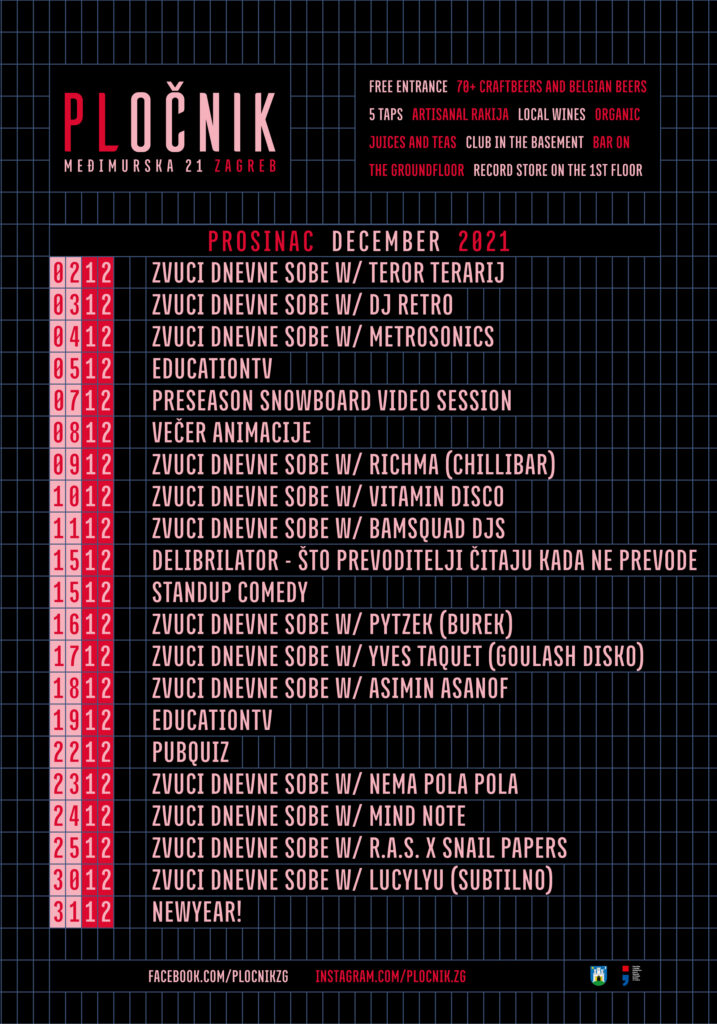 Pozdravljamo 2021. godinu uz pregršt glazbenih i drugih programa. Udobno se smjestite i počnite smišljati novogodišnje odluke, u Pločniku ih ujedno i zaboravite. Vidimo se na najluđim sjedećim tulumima u Međimurkskoj 21!