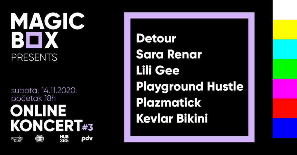 The six-hour-long, almost real concert experience will provide the audience on the other side of the screen with sounds from Detour, premiering with two new singers, girl-power trio Sara Renar and Playground Hustle, who will perform their first collaboration – a song “Kapital” after their solo performances, the band Lili Gee who recently signed for Croatia Records, Plazmatick, a producer who has been on the scene for 20 years with a freshly released album, and the new name on the list of performers are Kevlar Bikini hardcore punk trio from with four albums under their belt.