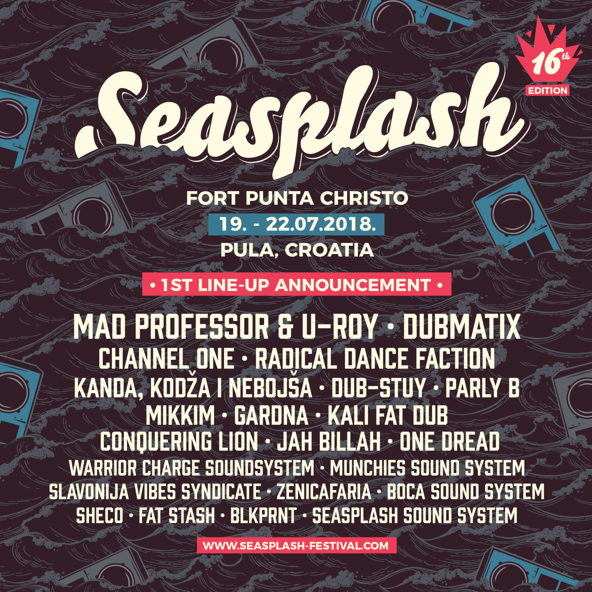 Seasplash, najdugovječniji regionalni festival bass glazbe i soundsystem kulture po 16. put se vraća u Pulu, gdje će od 19. do 22. srpnja okupiti ljubitelje dub, reggae, drum’n’bass glazbe i srodnih žanrova iz cijelog svijeta, kao i glazbene goste čija prva imena su upravo otkrivena. Živopisne pozornice smještene na tvrđavi Punta Christo, na štinjanskom poluotoku, besplatan kamp neposredno uz more, mnoštvo dodatnog programa, ljetni ugođaj i uvijek opuštena atmosfera, razlozi su zbog kojih je Seasplash jedan od najomiljenijih festivala u regiji. Ulaznice za 16. izdanje već su prodaji i mogu se naći na stranicama festivala.