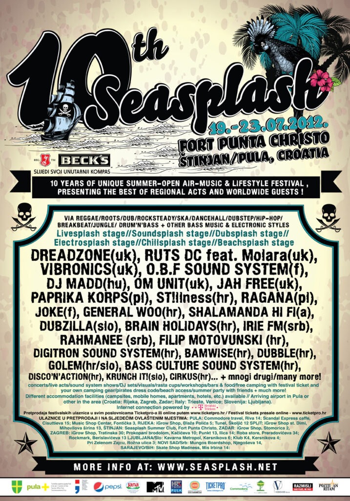 Za sve koji vole ritmove reggae, dub, ska, rocksteady, dancehall, dubstep, jungle, drum’n’bass, hip-hop, elektronske i plesne glazbe, veselu i opuštenu atmosferu, ples do ranojutarnjih sati, sunce i more, Seasplash je osigurao uvjete za idealno festivalsko ljetovanje: 4 dana cjelodnevnog glazbenog programa koncerata, dj-eva, vj-eva i soundsystema na 6 pozornica, dnevne programe na plaži, popratne kulturne i zabavne program: rasta cups, radionice, bazar, chill out zonu, koncept gusarske tematike sa sugeriranim gusarskim dress code-om i igrama bez granica u kojima se mogu osvojiti brojne nagrade, prijevoz posjetitelja do Pule i natrag i 4 dana besplatnog organiziranog kampinga za posjetitelje festivala!